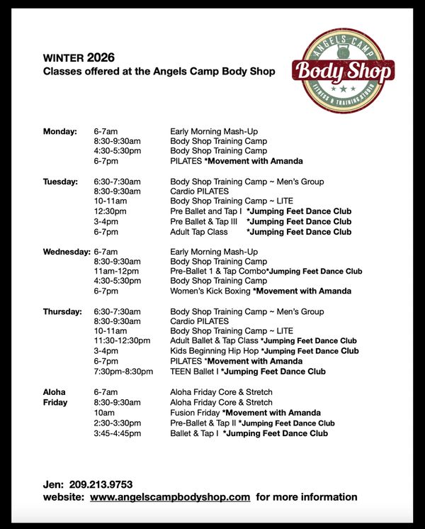 Join Krista Cruff from Starki's Travel Gymnastics and Tumbling on Saturday, February 14th and Saturday, February 28th at the Angels Camp Body Shop.